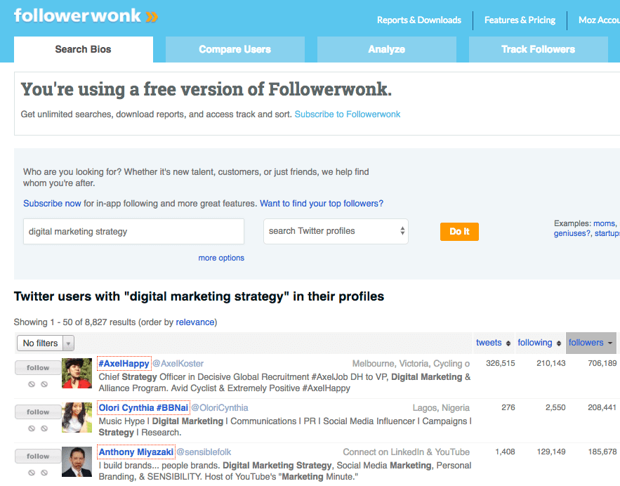 Followerwonk is still available as a free service that can be used to find influencers via their X bio, but this limits it, as these examples show. Most marketers I know wouldn't know of the top 3 'influencers' listed here. Instead, they are being rewarded for the use of auto-follow bots.