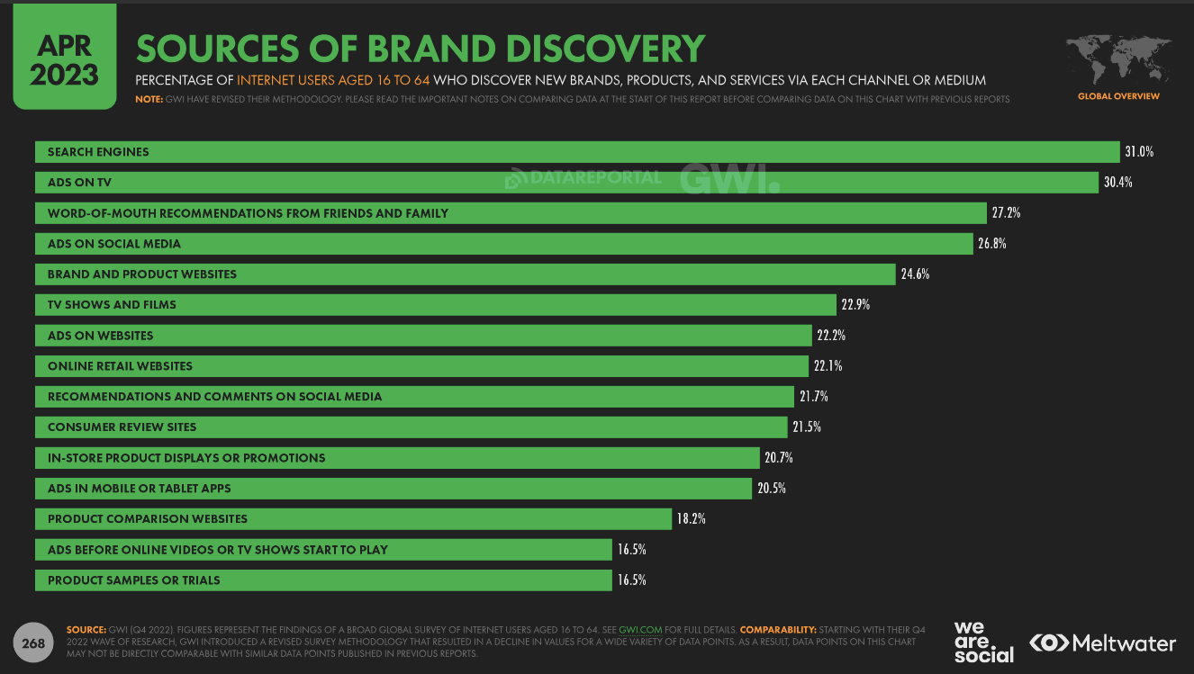 If you're not devoting enough resources to digital, or you're using an ad-hoc approach with no clearly defined strategies, then your competitors will eat your digital lunch since they will be more focused on always-on marketing! They will be adept at using the online marketing techniques such as organic and paid search and social media marketing which are so vital to gaining brand awareness online. The importance of digital channels in influencing brand discovery is highlighted by this research from Global Web Insight published in the Datareportal Global Snapshot report.
