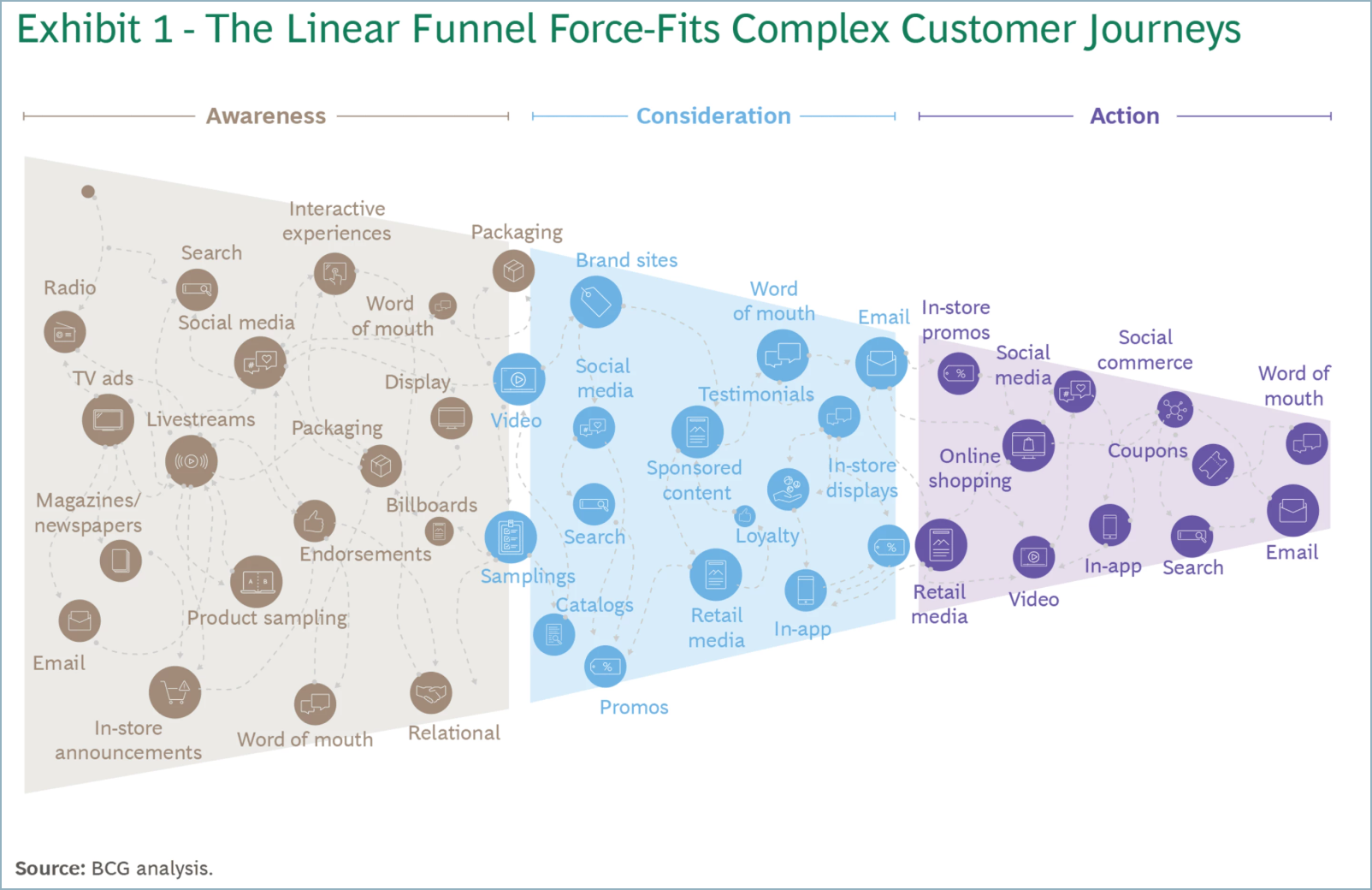 More recently, BCG in their 2025 article, It’s Time for Marketers to Move Beyond the Linear Funnel, also asserted that we need to move beyond the linear marketing funnel model to what they call 'influence maps'. This is based on the assertion that if you 'force-fit' touchpoints into the linear model it can miss a lot of nuance about how consumer behaviour and media and marketing planning to influence consumers works in practice. They hinted at this complexity as follows: